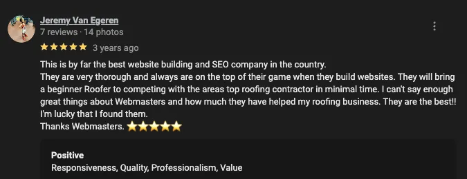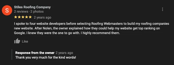 The answer is simple. No one has our track record of success. Roofing Webmasters has achieved outstanding SEO results for roofers since 2011! (Before all the internet "gurus" and bad players came out to screw you over.) Our team has the experience, expertise, and innovation to help contractors achieve their digital marketing goals. In addition, we are uniquely qualified to work with members of the roofing industry based on our proven track record in ranking local roofers online. We've helped over 500 roofing companies successfully and has generated millions in revenue for them. Also, our team of 14+ are US based out of Fort Worth Texas. We do not hire cheap unqualified virtual assistants or white label partners. We take results and success for your roofing company very seriously.